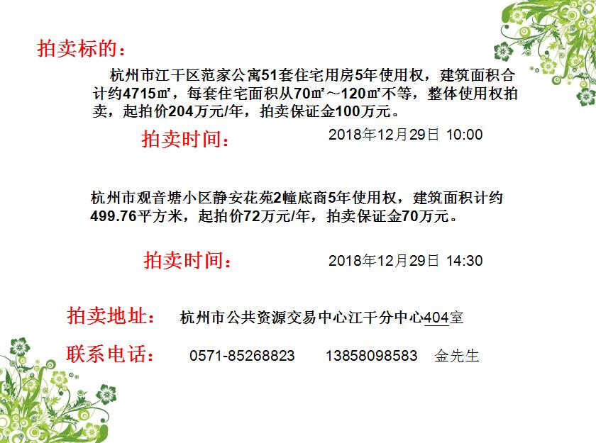 杭州市觀音塘小區(qū)靜安花苑2幢底商5年使用權(quán)/杭州市江干區(qū)范家公寓51套住宅用房5年使用權(quán)